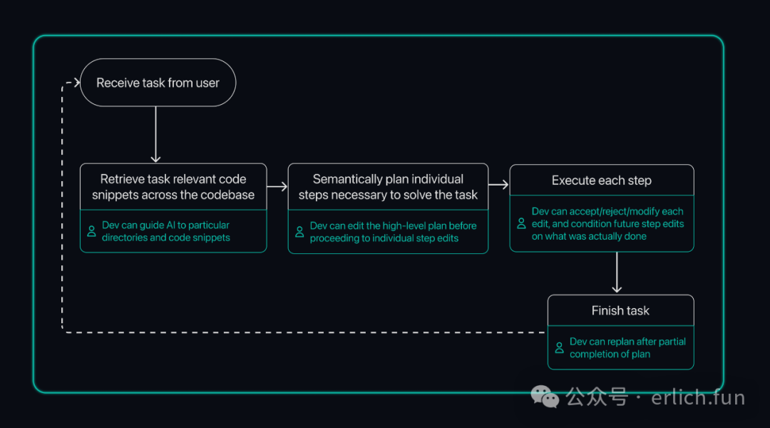 在 Copilot 模式下,LLM 只参与两个环节,这也是核心的限制所在,人类依然要处理很多的工作,并且在人类处理这些工作时,LLM 并不知道人类做了什么,结果怎么样,这会进一步导致接下来 Copilot 编辑可能会出错或者不全面。